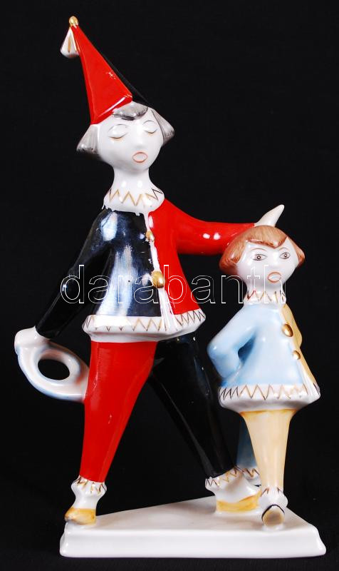 Bohócok, kézzel festett, aranyozott, jelzett Hollóházi figura /