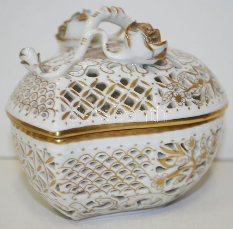 Herendi bonbonier, kézzel festett, áttört, arany színnel, apró lepatta... https://www.darabanth.com/de/181-Fernauktion/181.0/Andere-Sammelgebiete/Porzellan~200026/Herendi-bonbonier-kezzel-festett-attort-arany-szinnel-apro-lepattanasokkal-m9-cm-h11-c~II586203