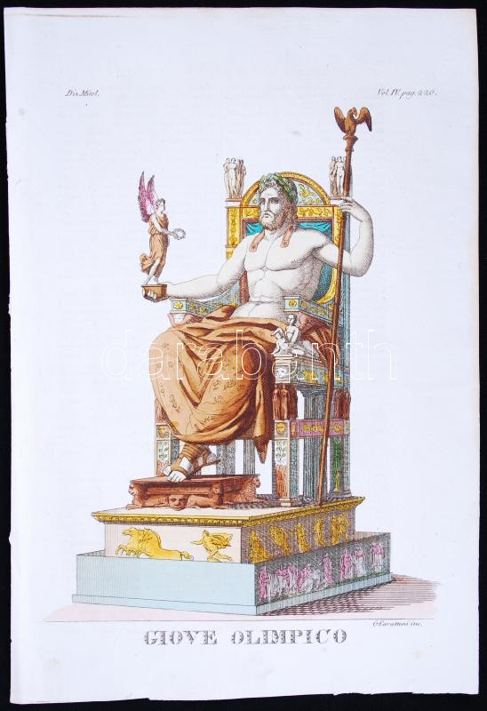 Girolamo Carattoni: Giove Olimpico. Színezett acélmetszet az 1823-ban Milánóban kiadott Dizionario d'ogni mitologica e antichita vol. IV illusztrációi közül, 15x23 cm
