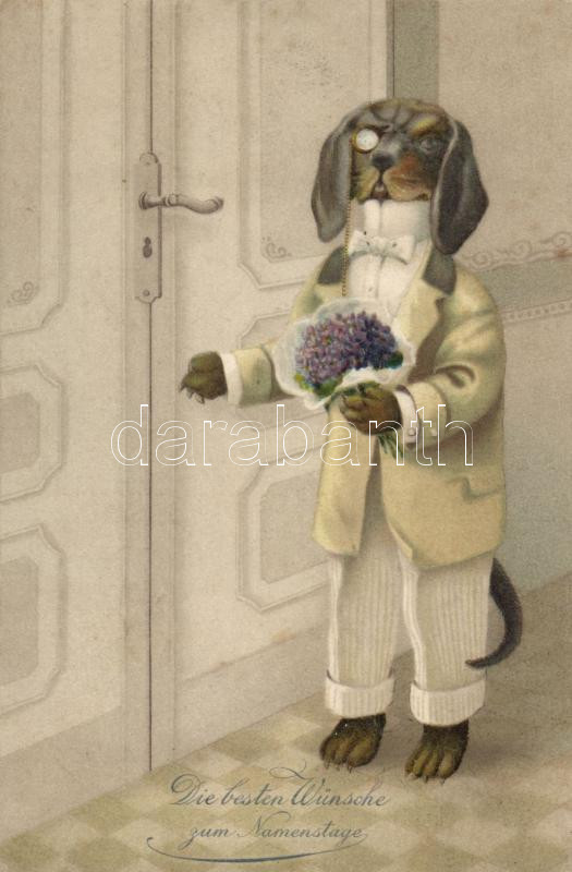 Dog in dress with bouquet, nameday, litho https://www.darabanth.com/de/181-Fernauktion/181.0/Ansichtskarten/Hunde~1000348/Dog-in-dress-with-bouquet-nameday-litho~II646309