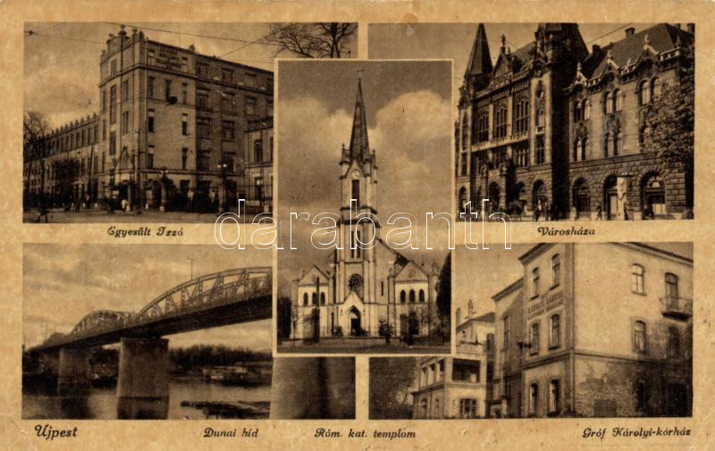 Beschreibung: Budapest IV. Újpest Egyesült Izzó, városháza, gróf Károlyi kórház, római katolikus templom, Duna híd (kis szakadás / small tear)