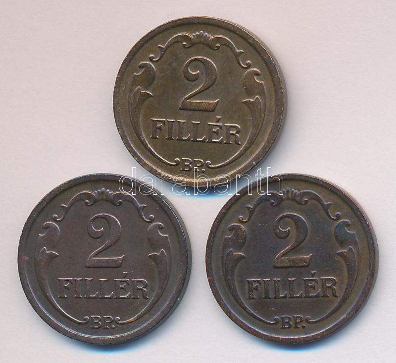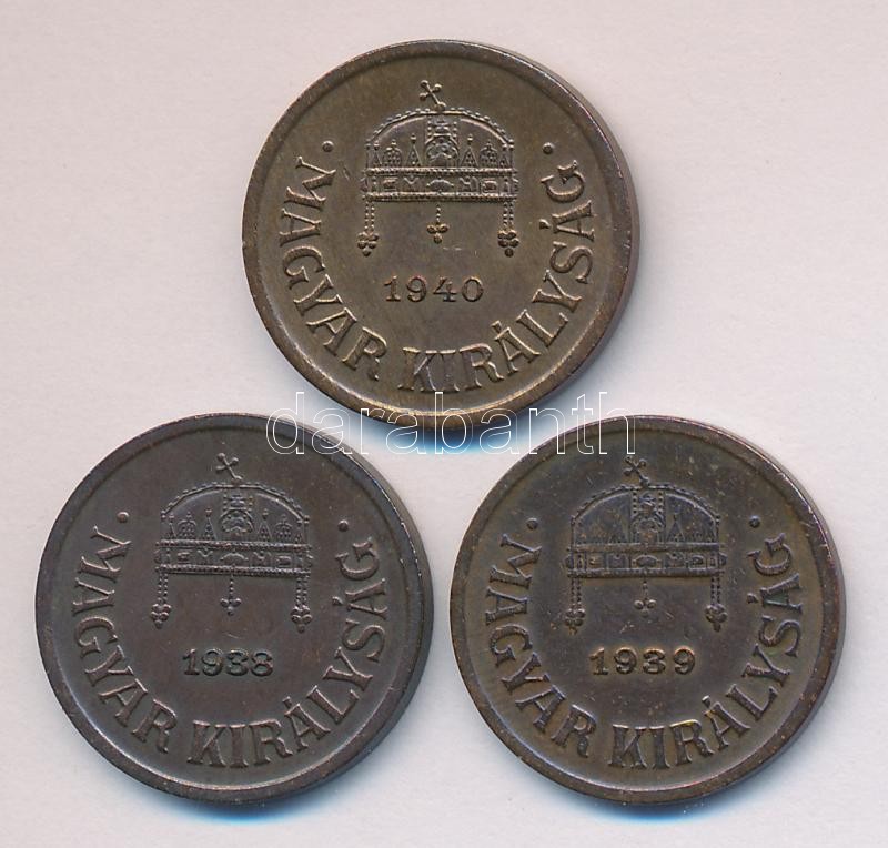 1938. 2f + 1939. 2f + 1940. 2f T:1-,2 https://www.darabanth.com/de/181-Fernauktion/181.0/Numismatik/Ungarische-Munzen~1000391/1938-2f-plus-1939-2f-plus-1940-2f-T1-2~II570117