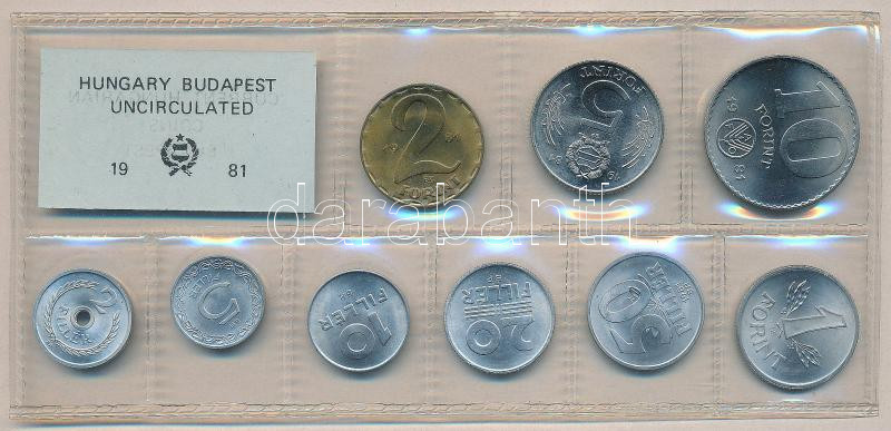1981. 2f-20Ft 10db klf érmés forgalmi sor fóliatokban T:1 https://www.darabanth.com/de/181-Fernauktion/181.0/Numismatik/Ungarische-Munzen~1000391/1981-2f-20Ft-10db-klf-ermes-forgalmi-sor-foliatokban-T1~II638152