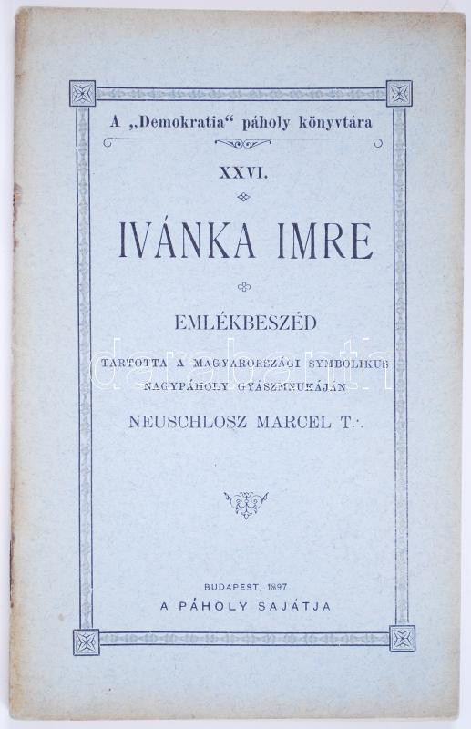 A "Demokratia" páholy könyvtára XXVI.: Neuschlosz Marcel: Iv... https://www.darabanth.com/de/182-Fernauktion/182.0/Andere-Sammelgebiete/Bucher-Freimauer~400045/A-Demokratia-paholy-konyvtara-XXVI-Neuschlosz-Marcel-Ivanka-Imre-Emlekbeszed-Bp-1897-~II655533