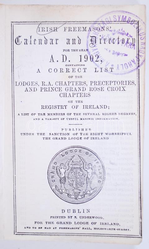Irish Freemaisons' Calendar and Directory for the Year 1902... Dublin, 1902, printed by S. Underwood for The Grand Lodge of Ireland. A Magyarországi Symbolikus Nagypáholy Könyvtárának pecsétjével, a kötés levált. /