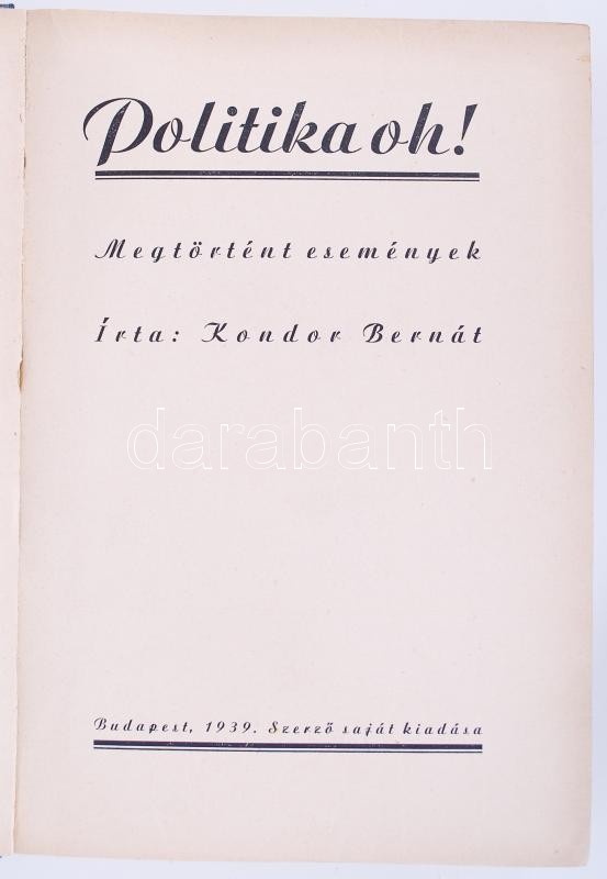 Kondor Bernát: Politika oh. Bp., 1939. Szerzői. 127p. https://www.darabanth.com/de/182-Fernauktion/182.0/Andere-Sammelgebiete/Bucher-Geschichte~400029/Kondor-Bernat-Politika-oh-Bp-1939-Szerzoi-127p~II638768