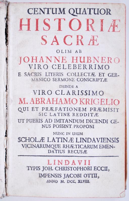 Centum quatuor historiae sacrae, olim ab Johanne Huberno viro Celeberrimo e sacris literis collectae et germanico seremone conscriptae... Leipzig, 1748 Jacobi Otti. 400p. Viaszos félbőr kötésben / Half leather binding