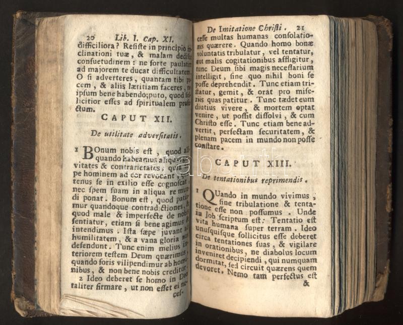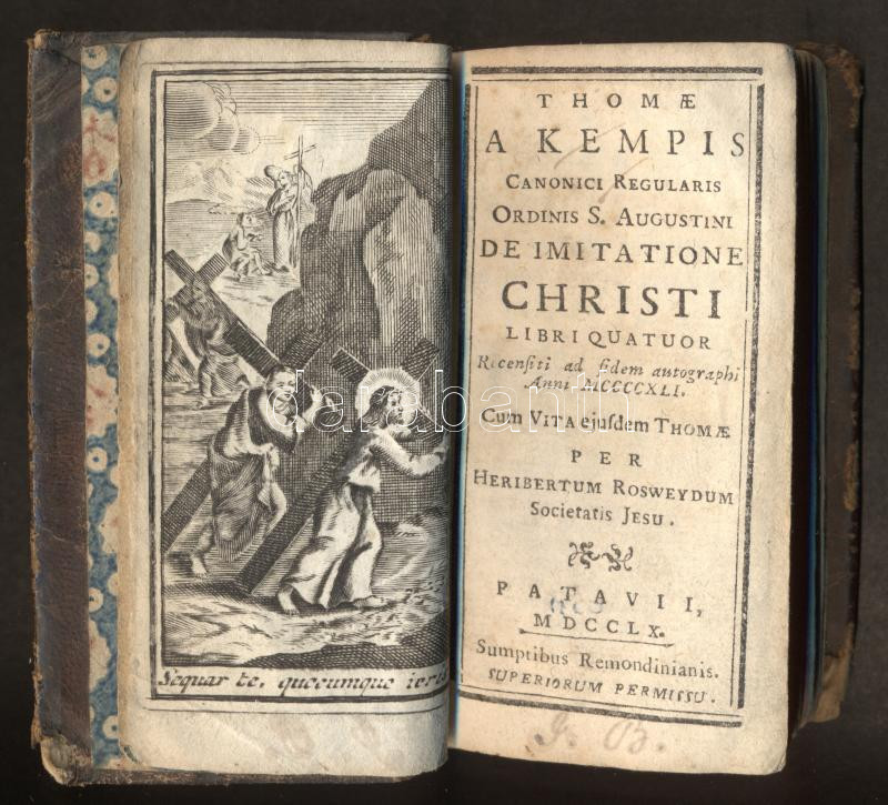 Thomae a Kempis canonici regularis ordinis S.Augustini. De imitatione Christi, libri quatuor. Patavii, 1760. Egy helyen szakadt egészbőr kötésben / In original leather-binding (small tear) 336p. 7x12 cm