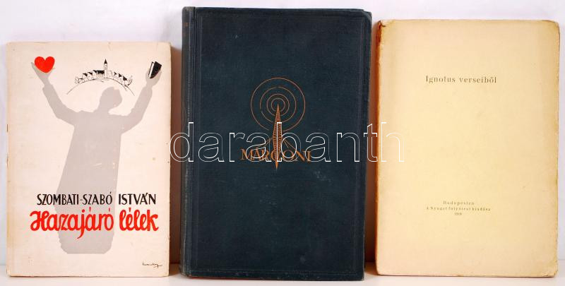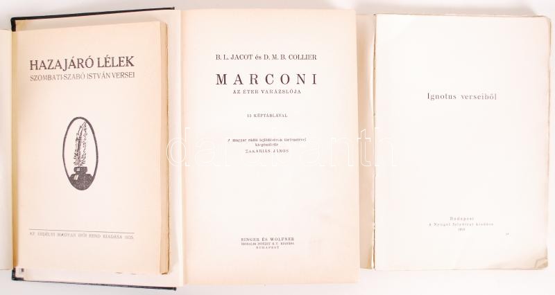 Beschreibung: 3db háború előtti kiadvány: Ignotus és Szombati-Szabó István verseskötete; valamint Jacot-Collier: Marconi