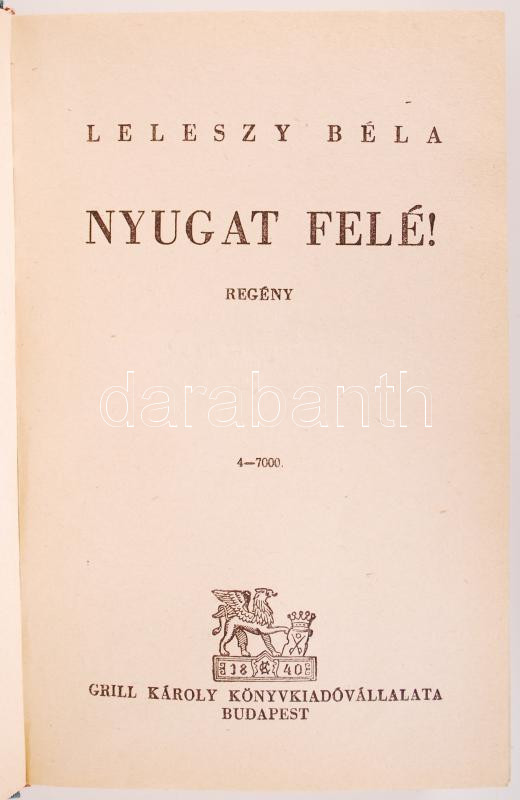 Leleszy Béla: Nyugat felé! Budapest 1942. Grill Károly Könyvkiadó Váll... https://www.darabanth.com/de/182-Fernauktion/182.0/Andere-Sammelgebiete/Bucher-Sonstige-Raritaten~400048/Leleszy-Bela-Nyugat-fele-Budapest-1942-Grill-Karoly-Konyvkiado-Vallalat~II653721