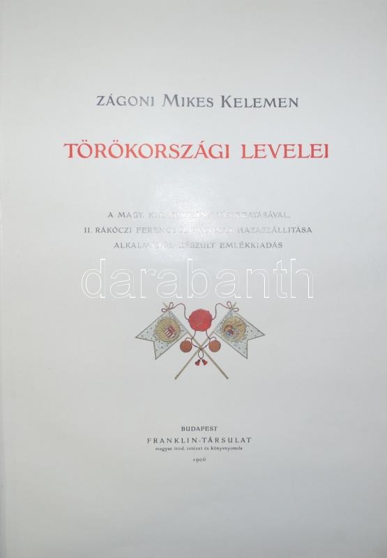 Zágoni Mikes Kelemen törökországi levelei. A magyar kir. kormány támogatásával, II. Rákóczi Ferencz hamvainak hazaszállitása alkalmából készült emlékkiadás. Budapest, 1906. Franklin. 233 p. + 39 t. (ebből 36 színes, a táblák előtt feliratos hártyapapírral) és 3 kézirat-hasonmás. Aranyozott félbőr kötésben.