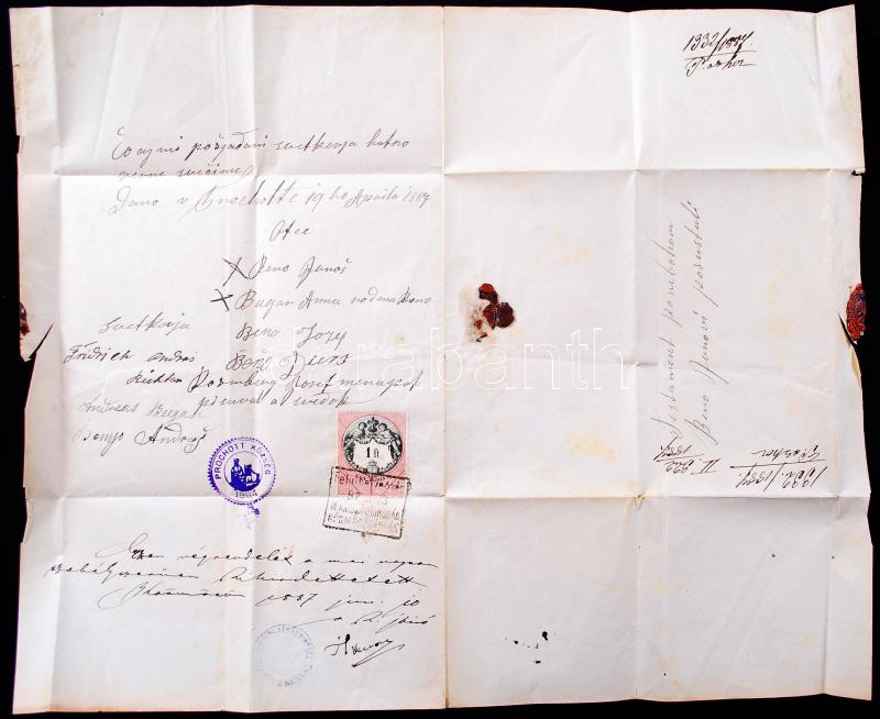 Beschreibung: 1887 Végrendelet Prochott község bélyegzőjével, 1Ft okmánybélyeggel / Testament with stamp of village Prochott