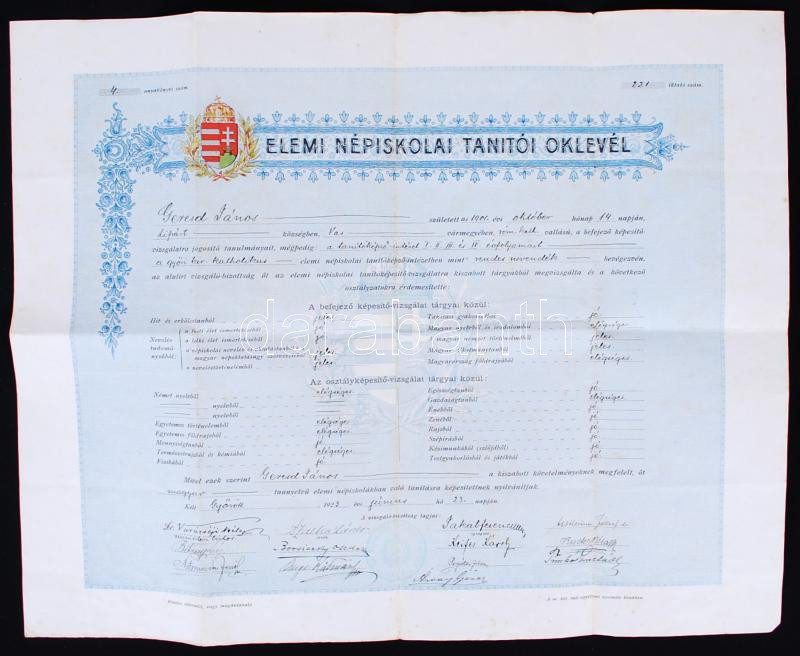 1923 Elemi népiskolai tanítói oklevél 49x39 cm https://www.darabanth.com/de/182-Fernauktion/182.0/Andere-Sammelgebiete/Dokument~400016/1923-Elemi-nepiskolai-tanitoi-oklevel-49x39-cm~II651116