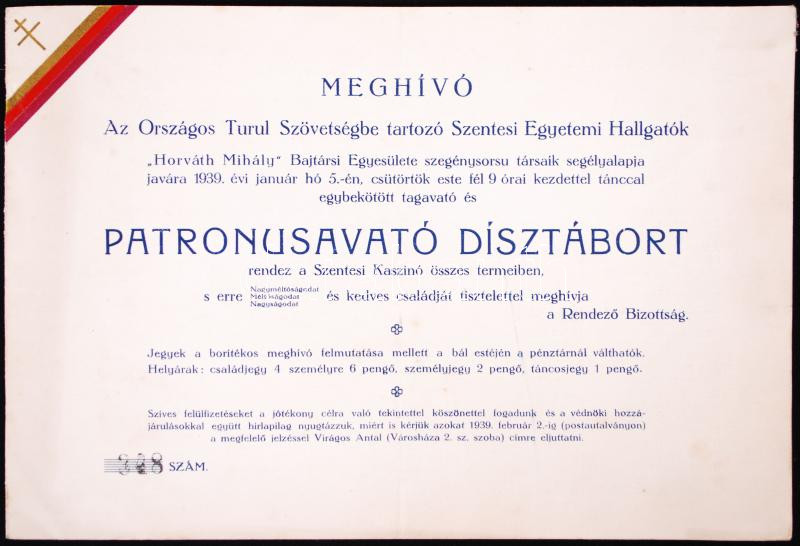 Beschreibung: 1939 Az Országos Turul Szövetség meghívója patrónusavató dísztáborba a rendezvény védnökeinek és szervezőinek névsorával