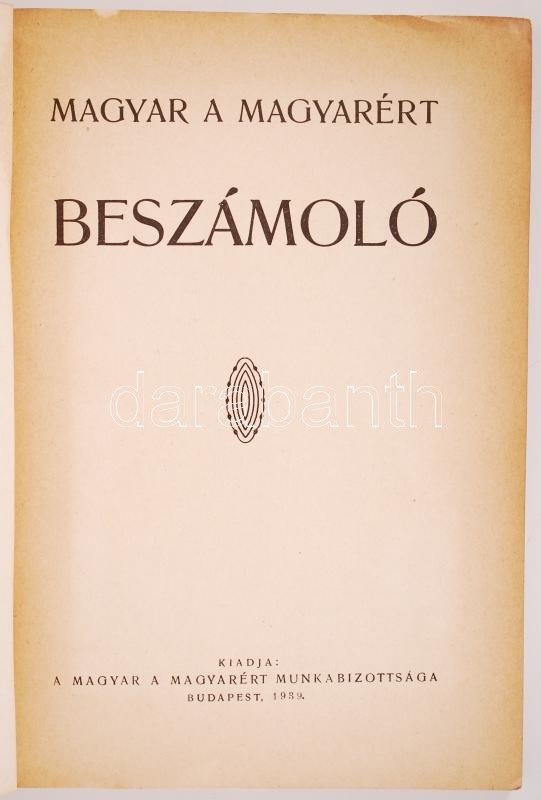 1939 Magyar a magyarért - a Felvidékért. Beszámoló. Bp., 1939, A Magyar a Magyarért Munkabizottsága, 112p. Papírkötésben, fotókkal és statisztikai mellékletekkel