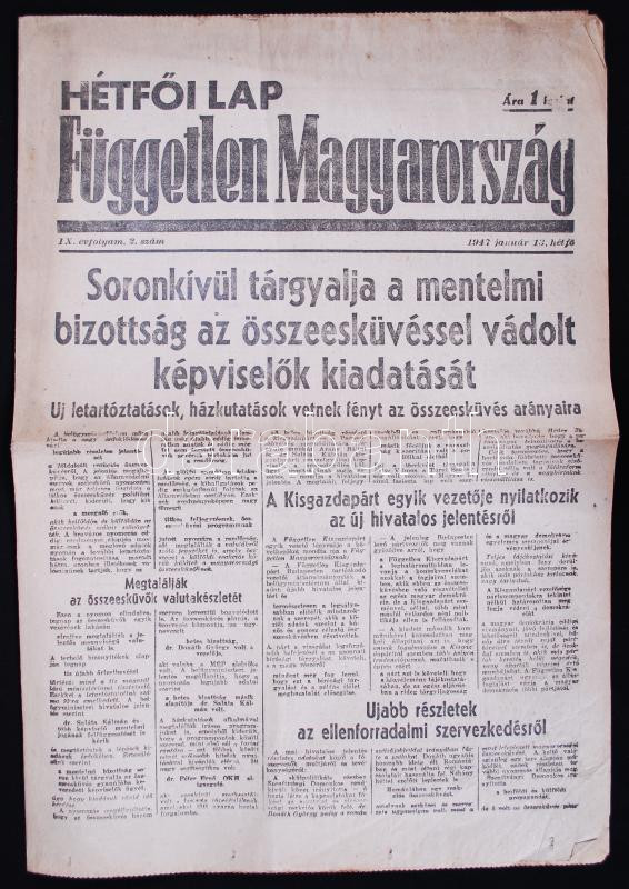 1947 Január 13. Független Magyarország. https://www.darabanth.com/de/182-Fernauktion/182.0/Andere-Sammelgebiete/Drucksachen~400039/1947-Januar-13-Fuggetlen-Magyarorszag~II650394