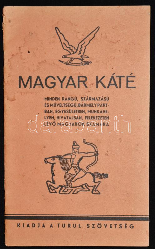 Beschreibung: Magyar Káté. Minden ranfgú, származású és műveltségű, bármely pártban, egyesületben, munkahlyen ... lévő magyarok számára. Turul szövetség 34p.
