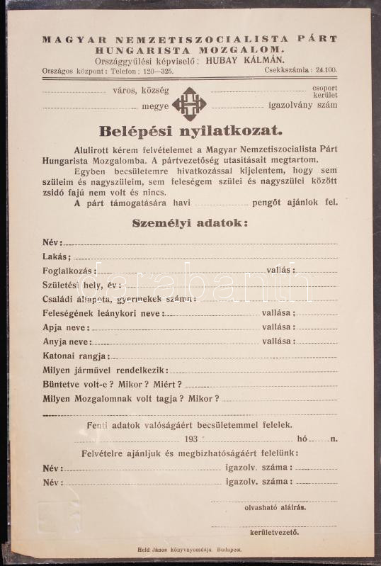 cca 1937/1940 2db hungarista nyomtatvány: belépési nyilatkozata a Magy... https://www.darabanth.com/de/182-Fernauktion/182.0/Andere-Sammelgebiete/Drucksachen~400039/cca-19371940-2db-hungarista-nyomtatvany-belepesi-nyilatkozata-a-Magyar-Nemzetiszocialista-Part~II652886