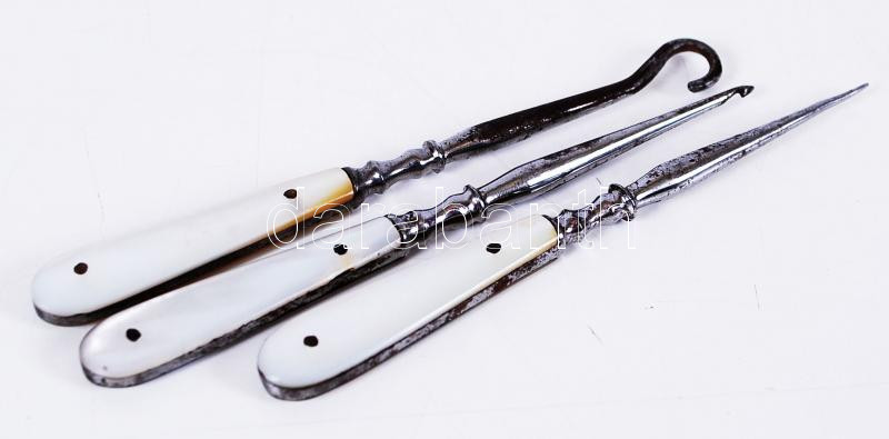 Beschreibung: cca 1930 3db gyöngyháznyelű horgoló-, ill. kötőtű /