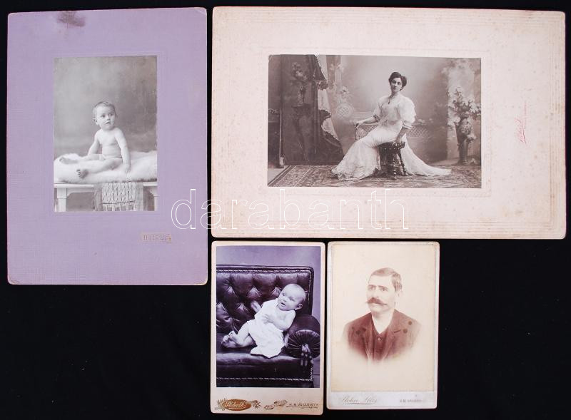 Beschreibung: 1900-1920 4db keményhátú fénykép a Till és a Plohn műtermekből: leletek Hódmezővásárhely fotótörténetéből, 17x11-22x34cm
