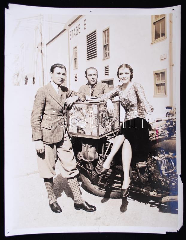 cca 1930 A világot megkerülő Bartha-Sulkowszky páros Los Angelesben a Paramount Studio előtt Rosita Moreno színésznővel. Sajtófotó. Szélén kis szakadás. / Hungarian world-wanderer bikers in Losa Angeles with Rosita Moreno 20x26 cm