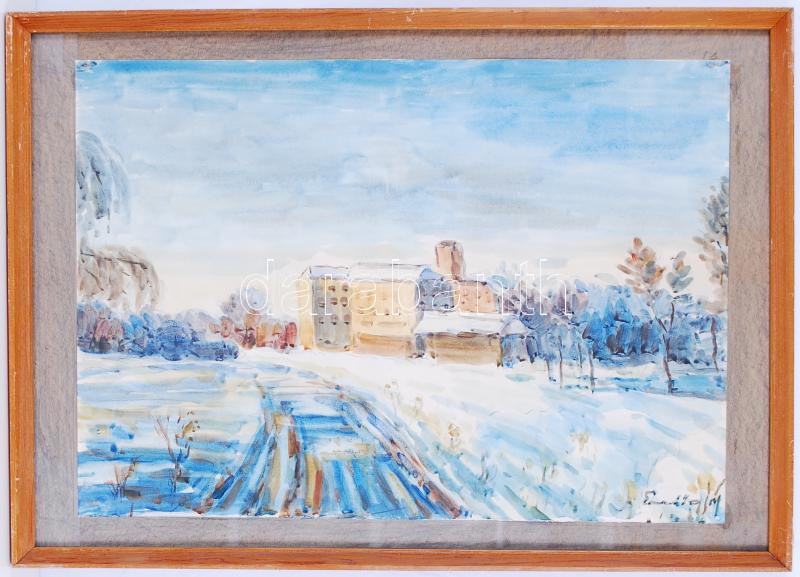 Beschreibung: Erdőssy jelzéssel: Téli táj épülettel. Akvarell, papír, üvegezett keretben 72×52 cm