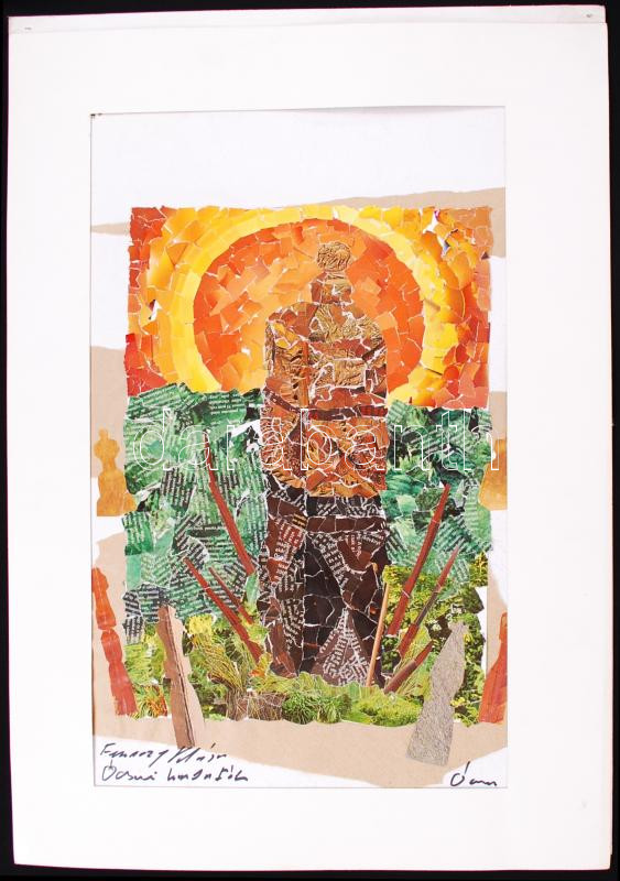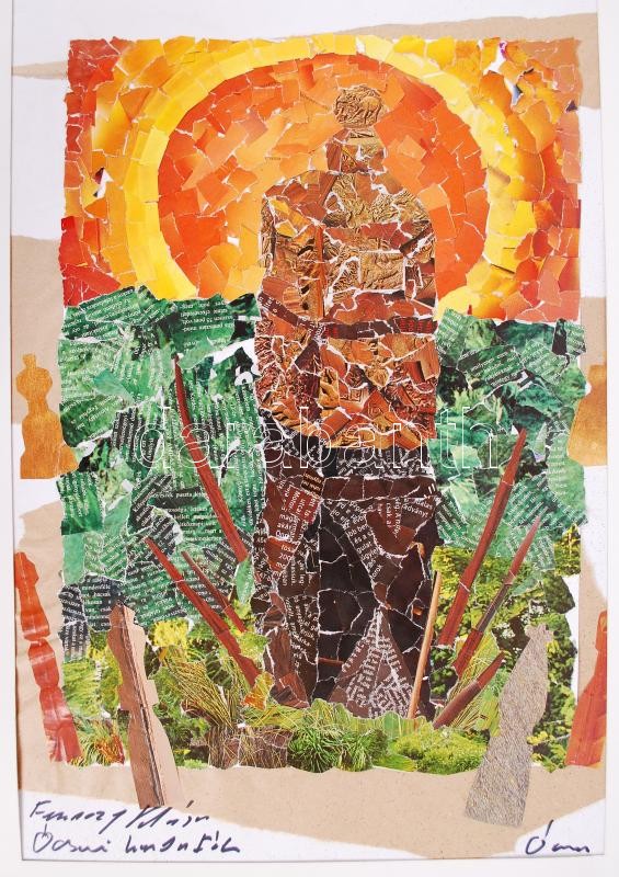 Beschreibung: Ferenczy Klára: Ócsai kopjafák. Kollázs, papír, jelzett, 70×50 cm