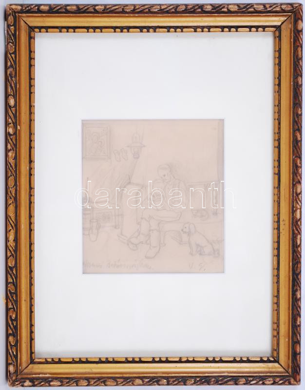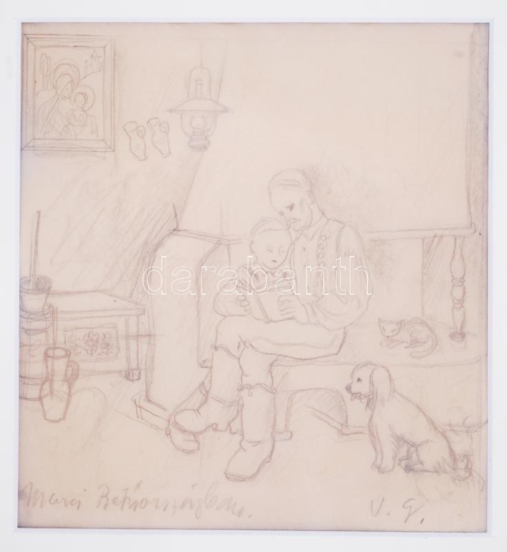 V.G. jelzéssel: Apa és fia. Ceruza, papír, üvegezett keretben 29×23 cm https://www.darabanth.com/de/182-Fernauktion/182.0/Andere-Sammelgebiete/Gemalde-und-Grafiken~400002/VG-jelzessel-Apa-es-fia-Ceruza-papir-uvegezett-keretben-29C39723-cm~II653237