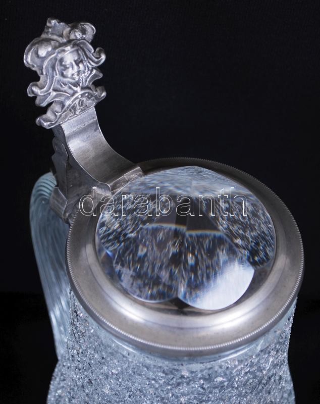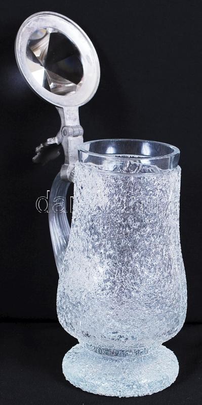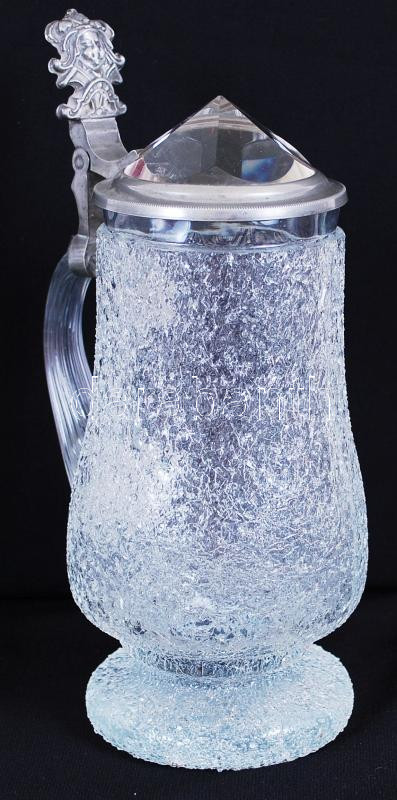 Beschreibung: 3-féle üvegművészeti technikát felhasználó, ón- és üvegfedelű, repesztett üveg korsó /