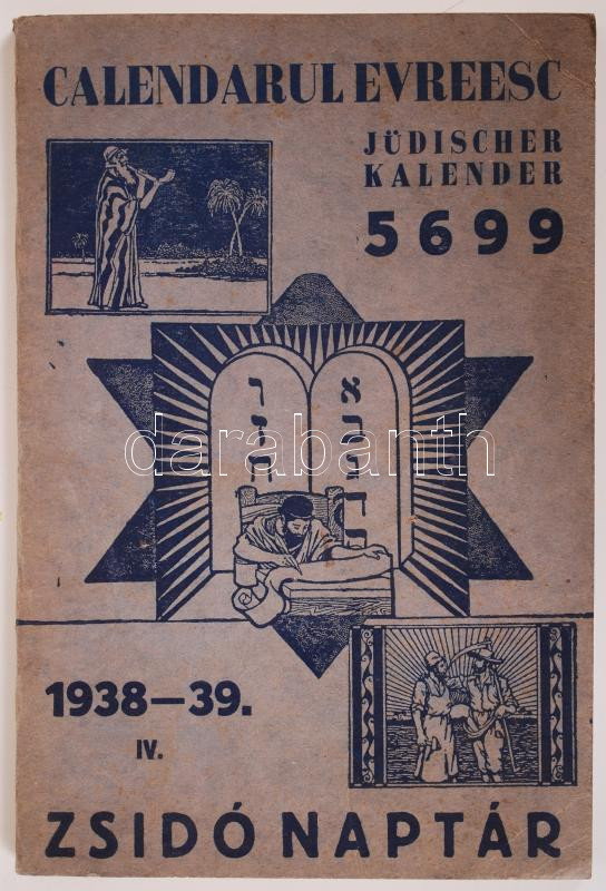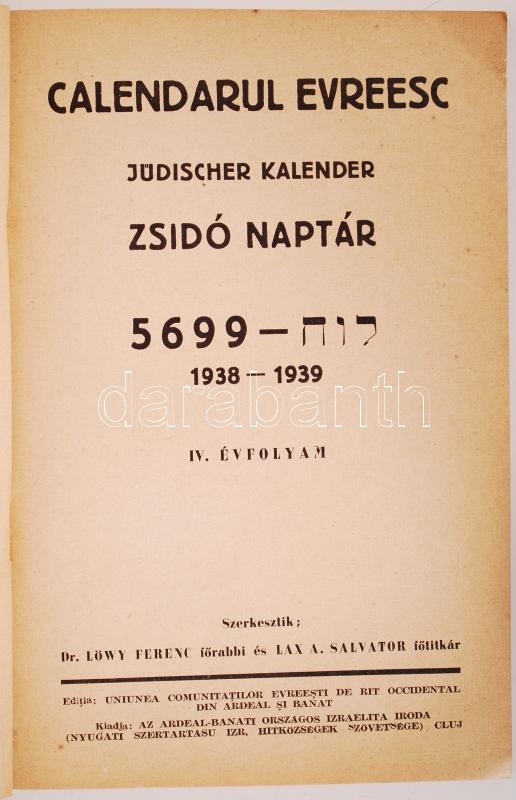 Calendarul evreesc - Jüdischer Kalender - Zsidó Naptár 5699/1938-39. IV. évf. Szerk. Dr. Löwy Ferenc főrabbi és Lax A. Salvator főtitkár. Kolozsvár (Cluj), Adreal-Banati Országos Izraelita Iroda