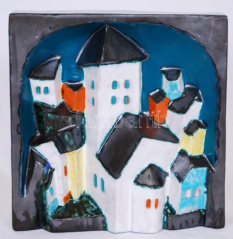 Beschreibung: Csekovszky Árpád (1931-1997): Falurészlet, kerámia fali dombormű, jelzett, hibátlan, új szerű állapotban, 23×23 cm, m:6 cm