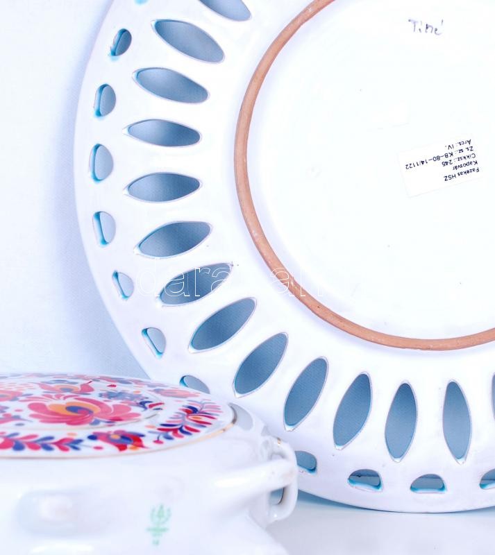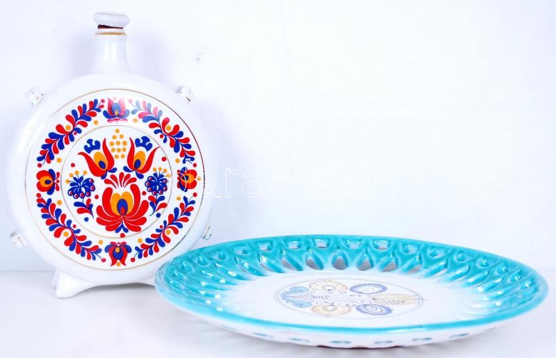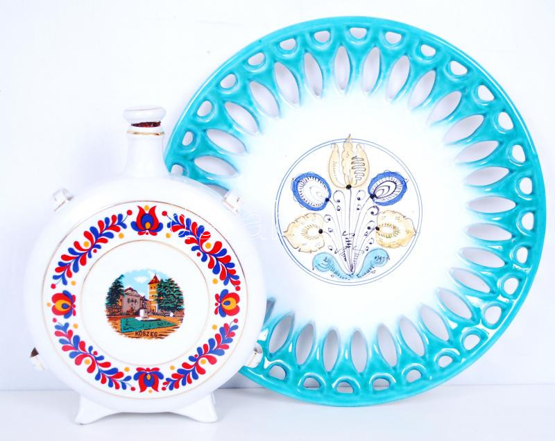 Beschreibung: Hollóházi kulacs Kőszeg látképpel, jelzett, hibátlan + kézi festésű áttört kerámia dísztányér d:28 cm