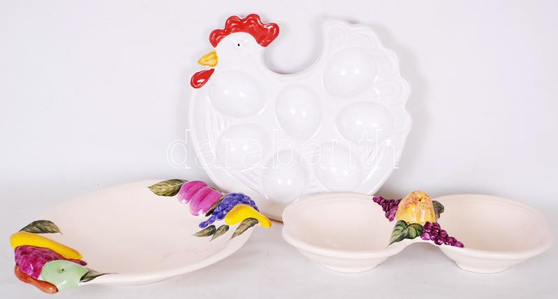 Beschreibung: Kézzel festett tojástartó és kínálótálak, egyik jelzett SKM, hibátlanok, összesen: 3 db, 23×18-23×23 cm