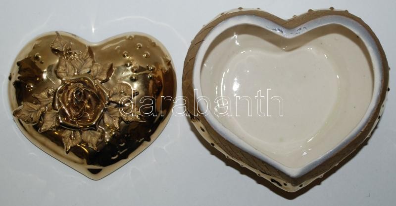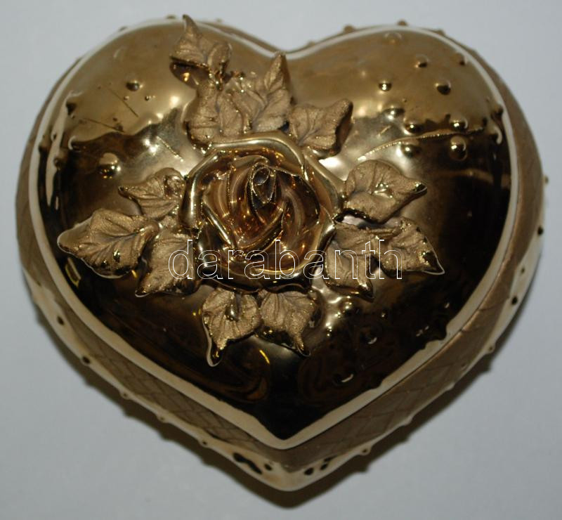 Beschreibung: Szív alakú bonbonier, rózsával a tetején, gazdagon díszítve és arany színnel bevonva, hibátlan, m:10 cm, sz: 16 cm