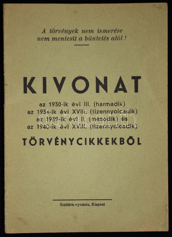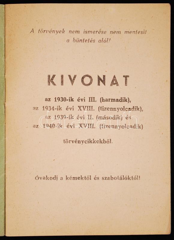 1940 Kivonat a háborúban alkalmazandó különleges törvényekből 16p. https://www.darabanth.com/de/182-Fernauktion/182.0/Andere-Sammelgebiete/Militaria~400025/1940-Kivonat-a-haboruban-alkalmazando-kulonleges-torvenyekbol-16p~II653206