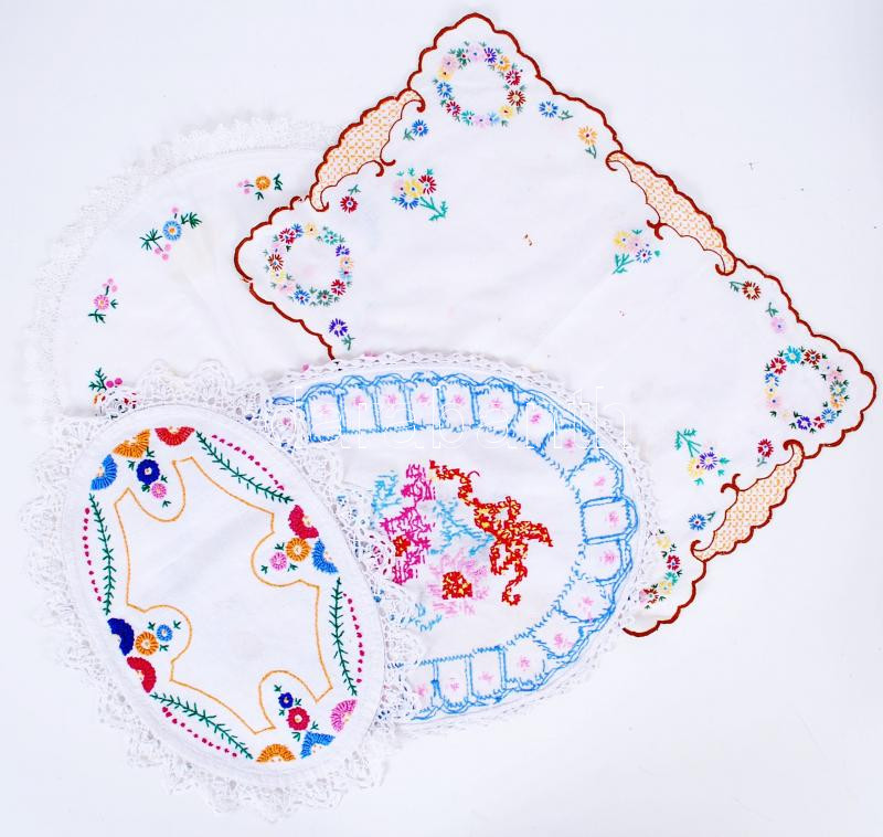 Beschreibung: cca 1960 4db, vegyes, kis méretű, hímzett terítő /