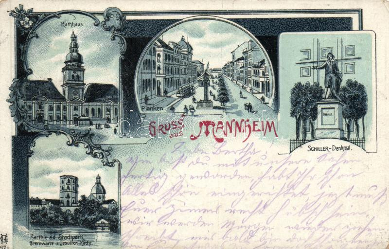 Beschreibung: Mannheim town hall, Planken, Schiller monument, city park with Jesuit Church, litho (small tear)