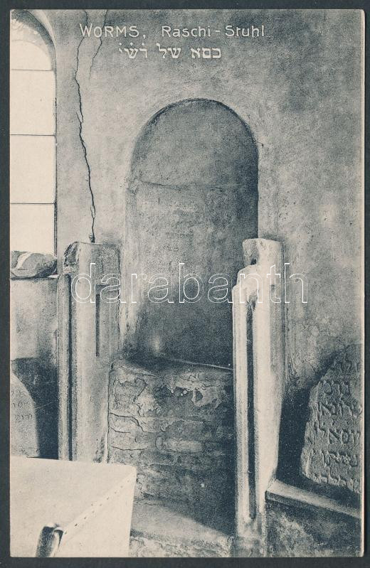 Worms, Raschi-Stuhl / synagogue, interior, hebrew text, Judaica https://www.darabanth.com/de/182-Fernauktion/182.0/Ansichtskarten/Deutschland~400421/Worms-Raschi-Stuhl-synagogue-interior-hebrew-text-Judaica~II506272