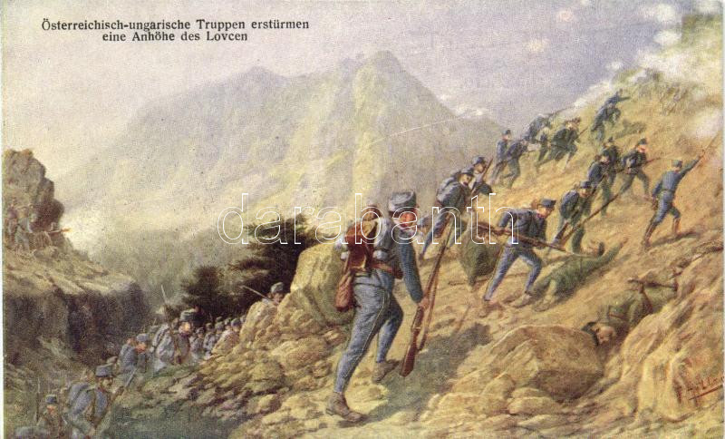 Austro-Hungarian troops on a hill of Lovcen, WWI, artist signed (EK) https://www.darabanth.com/de/182-Fernauktion/182.0/Ansichtskarten/Militaria~400361/Austro-Hungarian-troops-on-a-hill-of-Lovcen-WWI-artist-signed-EK~II651085