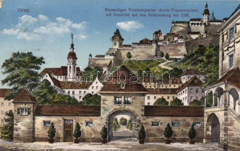 Graz Vicedomgarten with castle, artist signed https://www.darabanth.com/de/182-Fernauktion/182.0/Ansichtskarten/Osterreich~400420/Graz-Vicedomgarten-with-castle-artist-signed~II651456