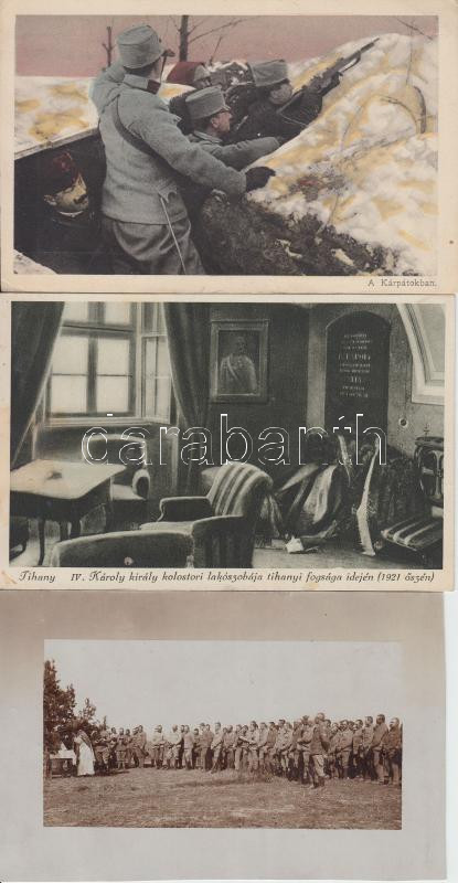 Beschreibung: 3 db régi képeslap: lövészárokban Kárpátok WWI, tábori mise az orosz fronton WWI, IV. Károly tihanyi kolostori lakószobája