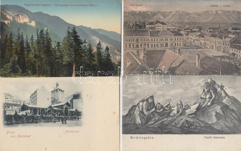 Beschreibung: 5 db régi képeslap: 2 erdélyi (Fogaras és Nagykőhavas), cseh (Karlovy Vary), svájci (Territet) és német (Watzmann mountain)