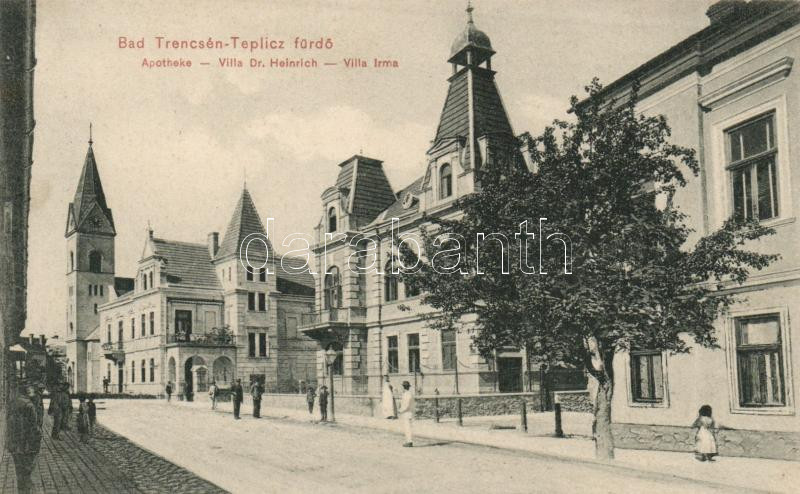 Trencsénteplic pharmacy, Villa Dr. Heinrich, Villa Irma https://www.darabanth.com/de/182-Fernauktion/182.0/Ansichtskarten/Slowakei~200008/Trencsenteplic-pharmacy-Villa-Dr-Heinrich-Villa-Irma~II652705