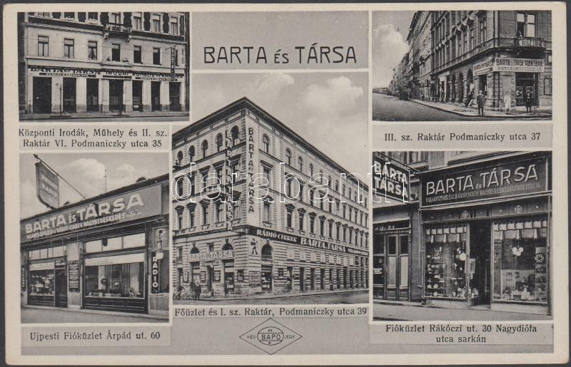 Budapest Barta és Társa rádiócikk üzletei, irodája és raktárai https://www.darabanth.com/de/182-Fernauktion/182.0/Ansichtskarten/Ungarn~200006/Budapest-Barta-es-Tarsa-radiocikk-uzletei-irodaja-es-raktarai~II653304