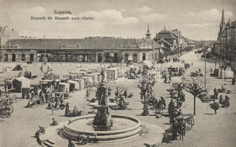 Beschreibung: Szentes Kossuth tér, Hoffmann Jakab áruháza, Plager Miksa műórás és ékszerüzlete, Reis József üzlete, Halász Szabó Lajos üzlete