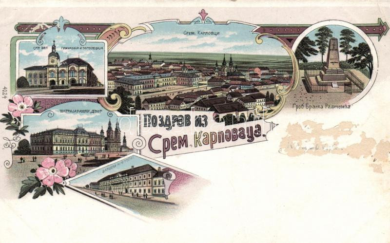 1899 Karlóca, Gymnasium, Art Nouveau, floral, litho (cut) https://www.darabanth.com/de/182-Fernauktion/182.0/Ansichtskarten/Vojvodina~200011/1899-Karloca-Gymnasium-Art-Nouveau-floral-litho-cut~II529445