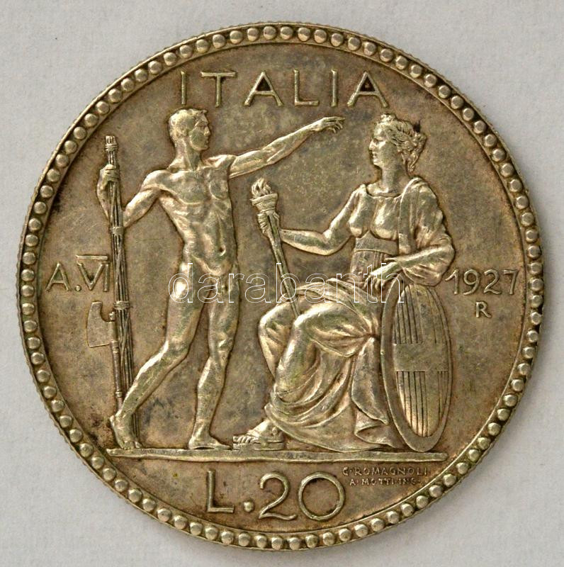 Italy 1927/VI 20 Lire Ag C:XF,VF https://www.darabanth.com/de/182-Fernauktion/182.0/Numismatik/Auslandische-Munzen~400433/Olaszorszag-1927VI-20L-Ag-T2-2--3Cbr3EItaly-1927VI-20-Lire-Ag-CXF-VF~II654368