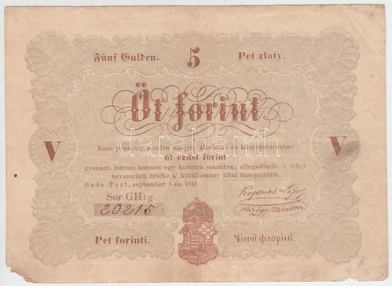 Beschreibung: 1848. 5Ft "Kossuth bankó" piros T:III(kis sarokhiány)