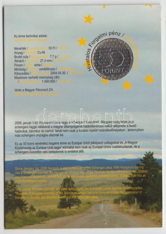 2008. (2004.) 50Ft "Magyarország a schengeni övezet tagja" e... https://www.darabanth.com/de/182-Fernauktion/182.0/Numismatik/Ungarische-Munzen~400429/2008-2004-50Ft-Magyarorszag-a-schengeni-ovezet-tagja-emlekkiadas-emleklapon-T1~II652683