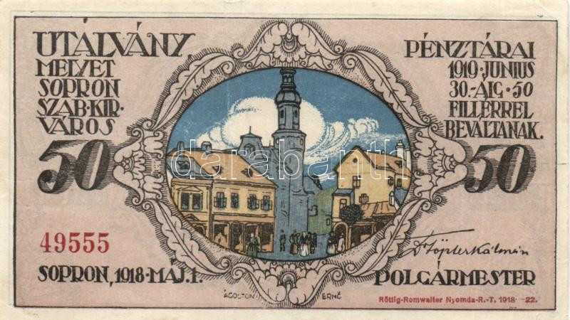 Sopron 1918. május 1. 50f utalvány T:II- https://www.darabanth.com/de/182-Fernauktion/182.0/Numismatik/Ungarische-und-Auslandische-Notgelden~400427/Sopron-1918-majus-1-50f-utalvany-TII-~II651986